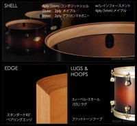 メイプルのパワー感とアフリカンマホガニーのあたたかさがブレンドされ、バランスの取れた低音とアタックが両立。薄めのシェルにマッチングするSTLタイプのスィーベル・スモールラグによって、プレイヤーにとって心地よいそば鳴り(=シェルが近くで鳴っている感覚)が強調されます。