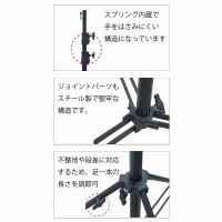 高さ最大338cm 耐荷重40kg のスタンドです。三脚を広げた直径は最大132cm。三脚のうち1 本の足は、不整地に対応するよう伸縮が可能です。高さ調整中に誤って緩めてしまっても手を挟まないようスプリングによるインターバルが設けられています。ダボ受けは日本向けに17mm を採用し、カラーはブラックを用意しております。