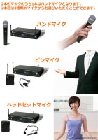 マイクの種類はご購入時に2種類をお選びください。なお、1本はハンドマイク固定となります。2本目をハンドマイク、ピンマイク、ヘッドセットタイプの中から、お選びください。